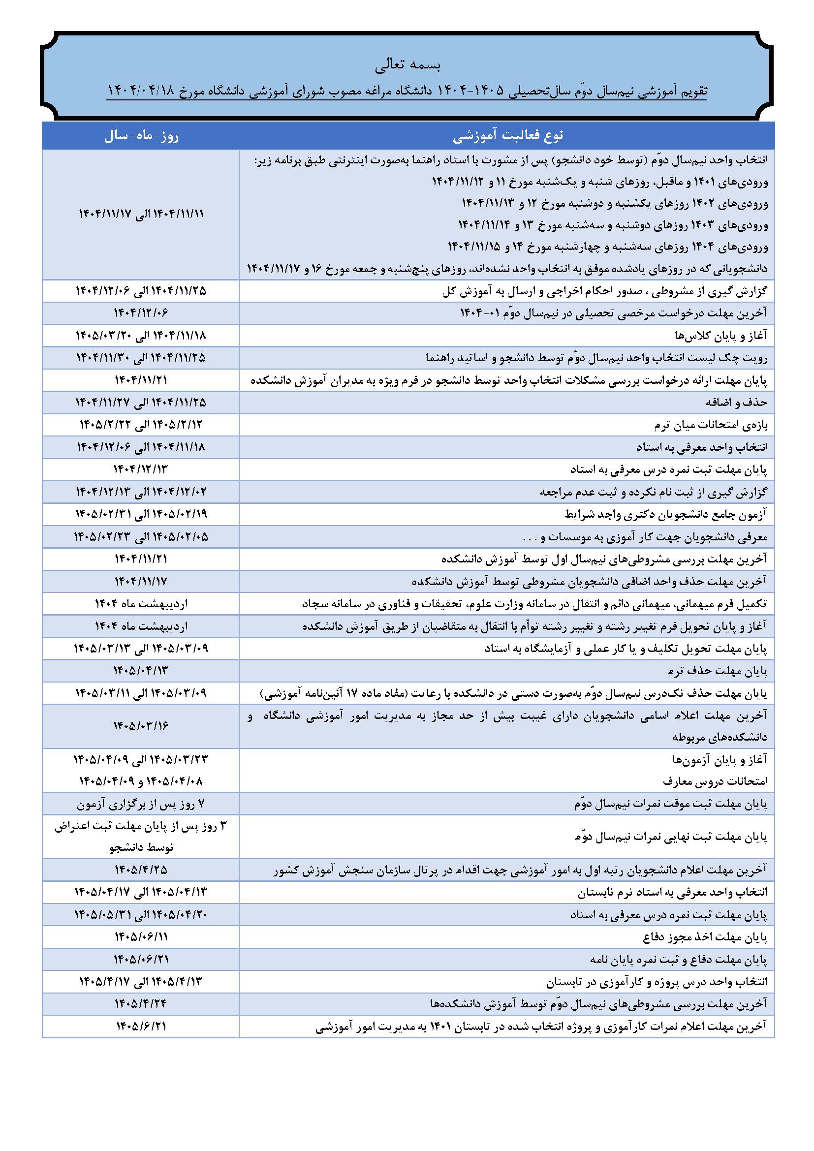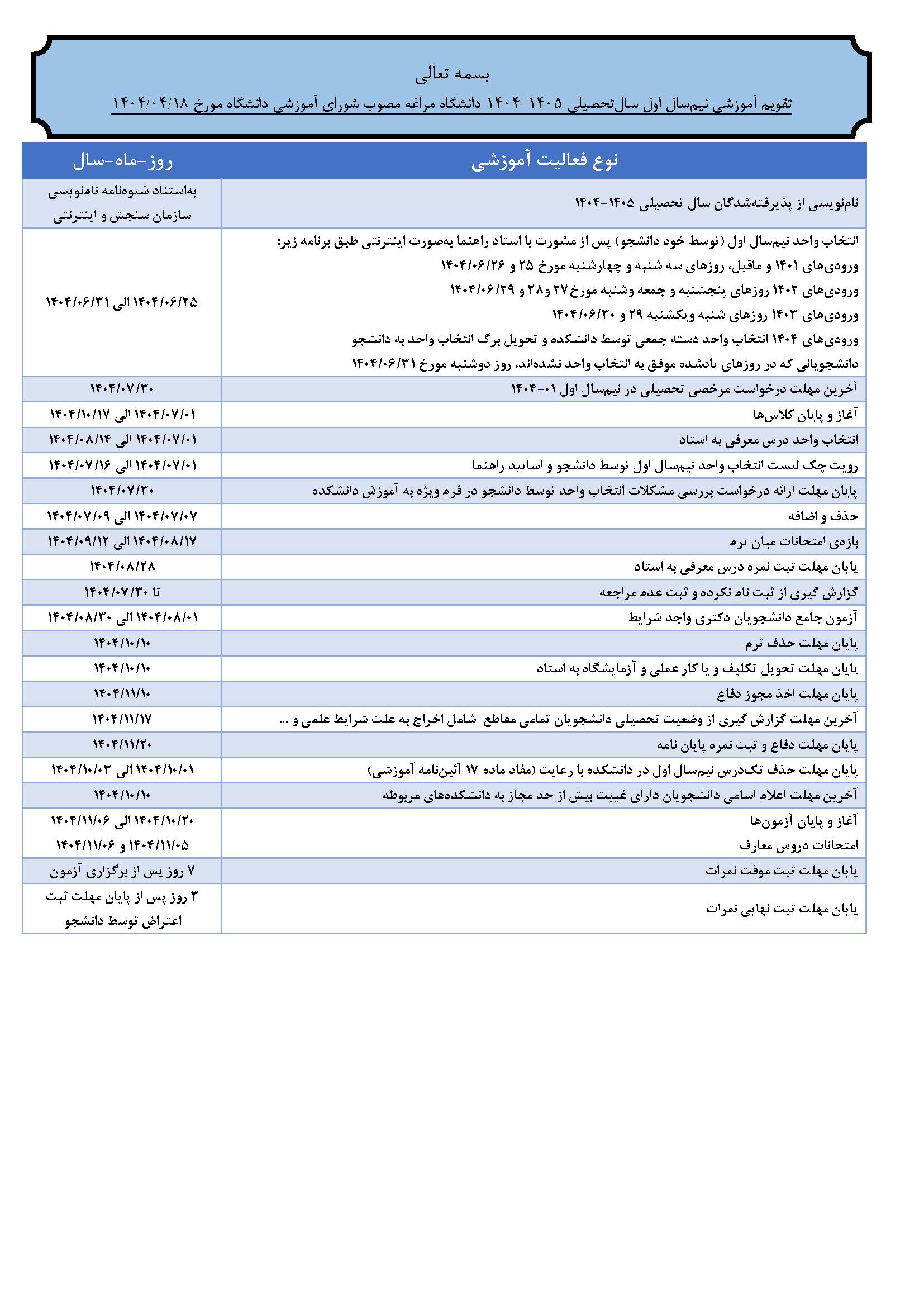 تقویم آموزشی سال تحصیلی ۱۴۰۵_۱۴۰۴ دانشگاه مراغه